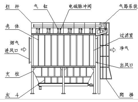 消灰過程是由控制儀按規(guī)定要求對(duì)各個(gè)電磁脈沖閥發(fā)出指令,依次打開閥門,順序向各組濾袋內(nèi)噴吹高壓空氣。于是,氣包內(nèi)壓縮空氣經(jīng)由噴吹管的孔眼穿過文氏管進(jìn)入濾袋(稱為一次風(fēng))。而當(dāng)噴吹的高速氣流通過文氏管——引射器的一剎那,數(shù)倍于一次的周圍空氣被誘導(dǎo)同時(shí)進(jìn)入袋內(nèi)(稱二次風(fēng))。由于這一、二次風(fēng)形成一股與過濾氣流相反的強(qiáng)有力逆向氣流射入袋內(nèi),使濾袋在二瞬間急劇從收縮——膨脹——收縮,以及氣流反向作用,遂將吸附在袋壁外面的粉塵清除下來。由于清灰時(shí)向袋內(nèi)噴吹高壓空氣是在幾組濾袋間依次進(jìn)行的,并不切斷需要處理的含塵空氣,所以在清灰過程中,集塵器的壓力損失和被處理的含塵氣體量都幾乎不變,這一點(diǎn)就是脈沖袋式除塵器的先進(jìn)性。