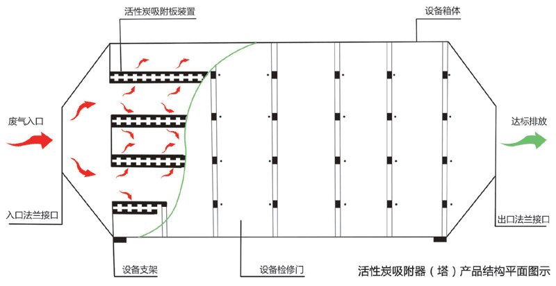 當(dāng)有機(jī)廢氣氣體由風(fēng)機(jī)提供動力,正壓或負(fù)壓進(jìn)入塔體,由于活性炭固體表面上存在著未平衡和未飽和的分子引力或化學(xué)健力。