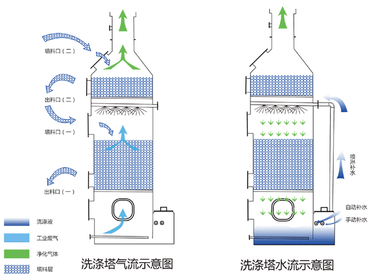 氣流中的粒狀污染物與洗滌接觸后,液滴或液膜擴(kuò)散附于氣流中的粒子上或者增濕于粒子,使粒子借著重力、慣性等作用達(dá)到分離去除的目的。氣態(tài)污染物質(zhì)則借著絮流分子擴(kuò)散等質(zhì)量傳送,以及化學(xué)反應(yīng)等現(xiàn)象傳送洗滌 液體中達(dá)到與進(jìn)入流分離的目的,并可在洗滌液中添加化學(xué)物質(zhì),以吸收方式控制氣狀臭味物質(zhì)。廢氣經(jīng)由填充 式洗滌塔和洗滌液進(jìn)行吸收中和(利用填充物増加接觸表面積),以去除廢氣中的有害微粒物質(zhì)。